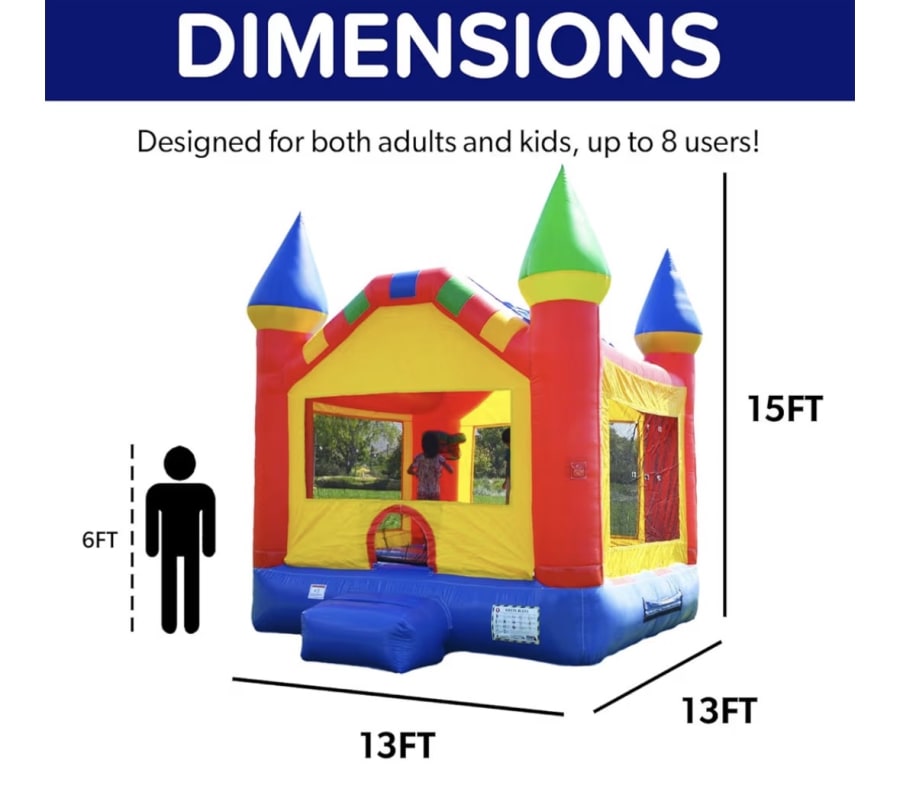 Spacious Play & Built-in Hoop: This 13'L x 13'W x 15'H unit provides a generous jumping zone designed for both children and adults. To maximize the fun, it features an integrated interior basketball hoop, making it an ideal centerpiece for active birthday parties and events.